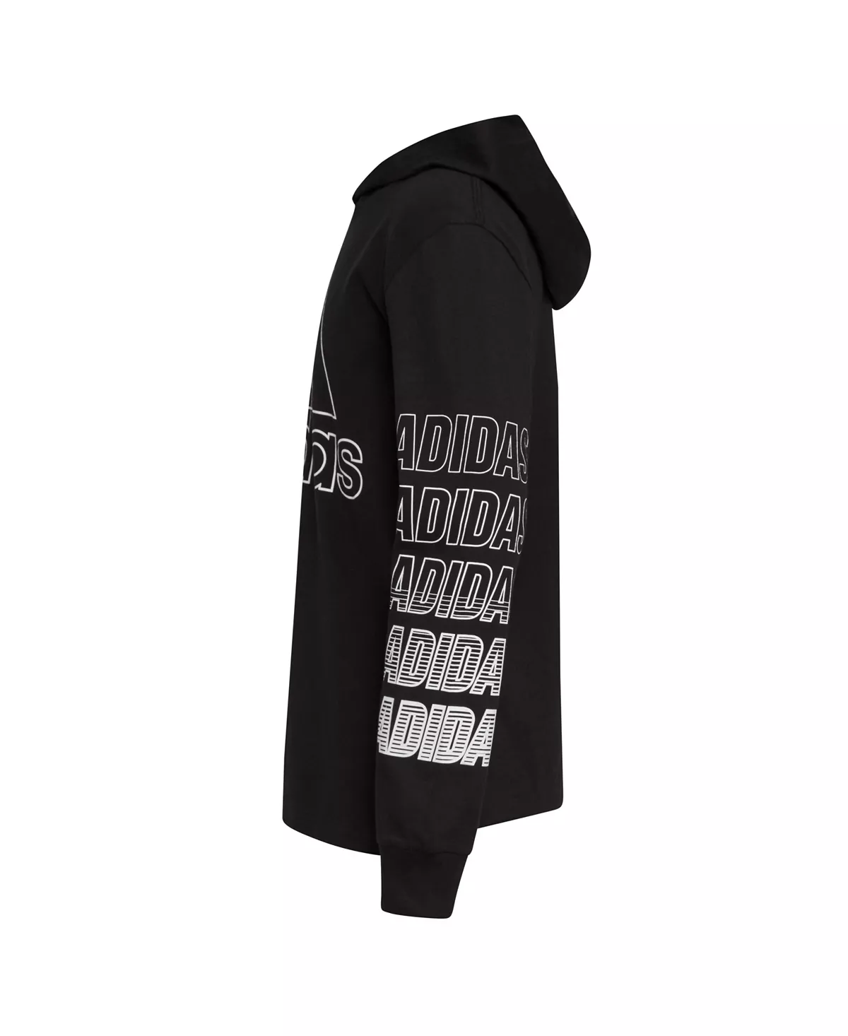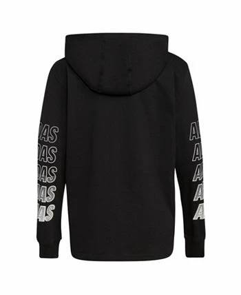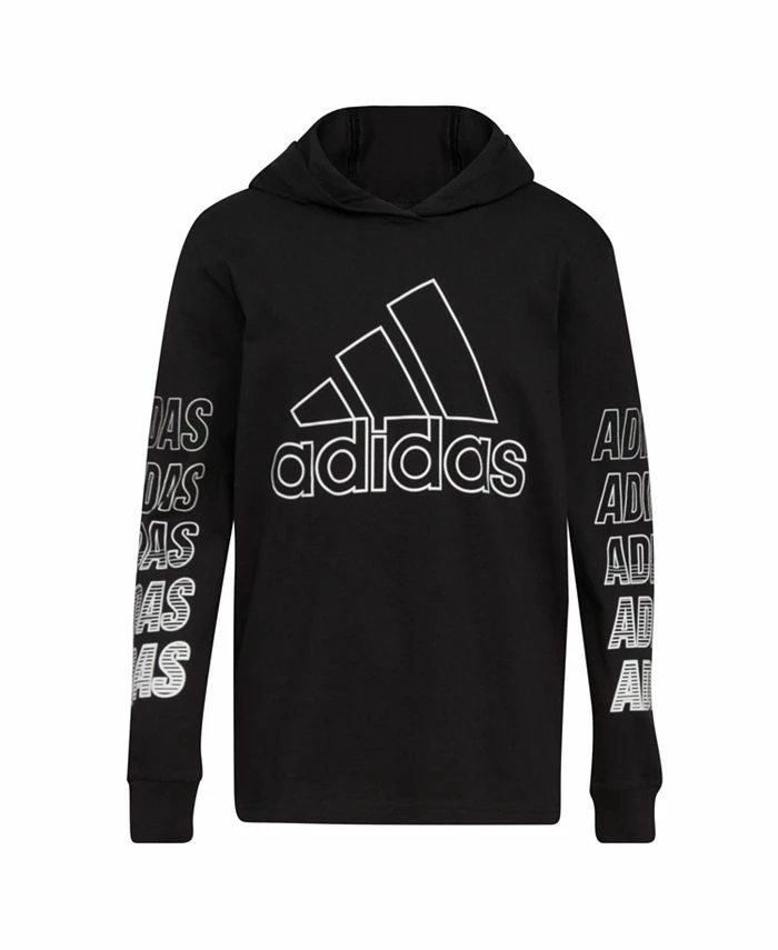 This boys long sleeve hooded T-shirt says adidas with bold graphics down the sleeves and on the chest. It’s made of jersey that’s soft and easy to wear. This hoodie T-shirt can be worn alone or layered under a sweatshirt.