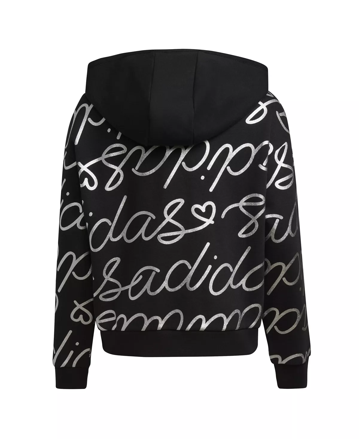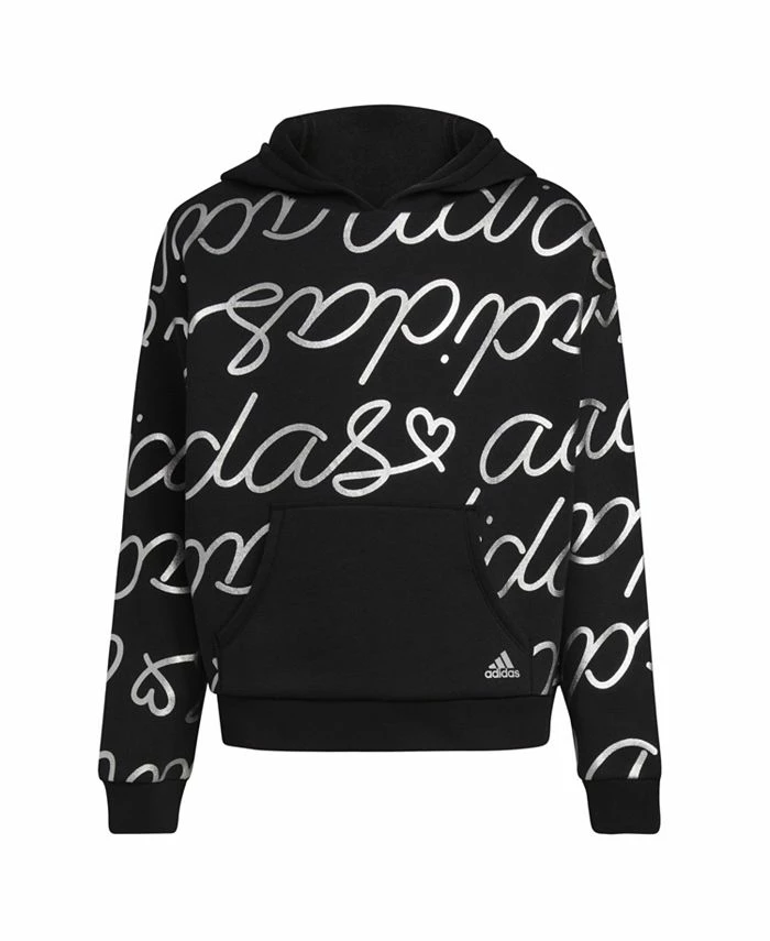 Signature adidas style is literally written all over this girls hoodie in color foil letters. Soft comfort comes standard with a loose fit and warm fleece.