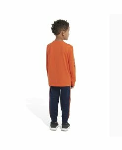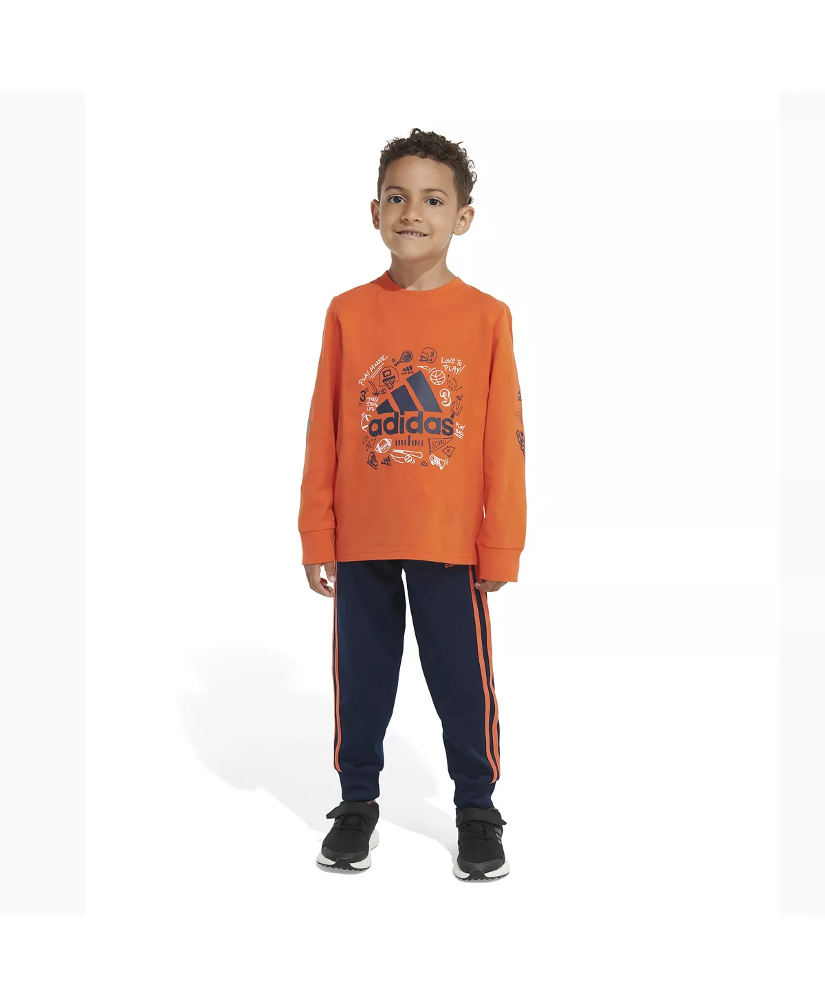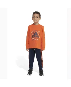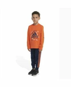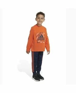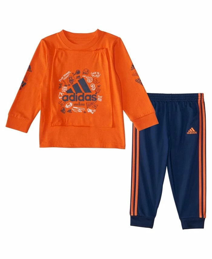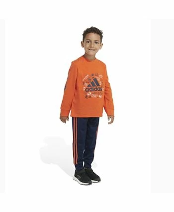 Getting ready every day just became super easy. This boys 2-piece outfit gives him everything he needs. Tricot joggers match up with the soft cotton T-shirt, so he can gear up and go. From a sporty graphic to 3-Stripes, both pieces are all adidas.