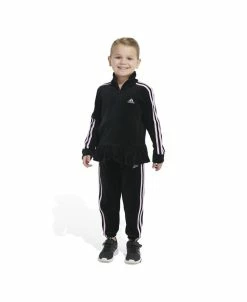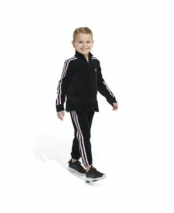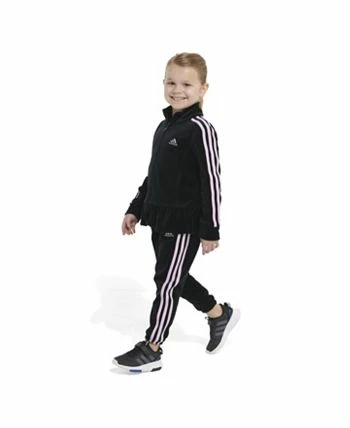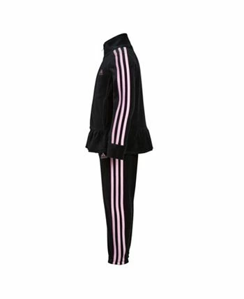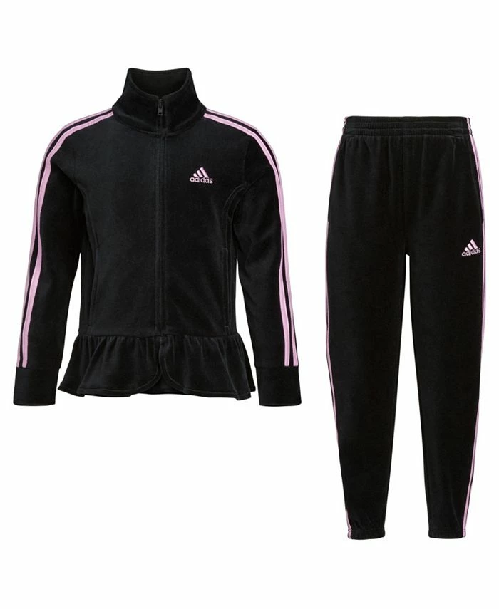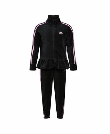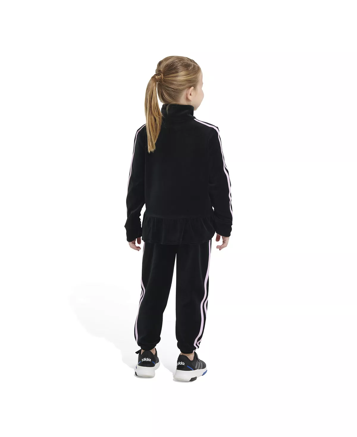 Plush and feminine. Just how she likes it. This two-piece girls outfit gives her the goods. Both pieces are made of velour, so she can be glam and sporty. Keep her look low-key with OG adidas 3-stripes.