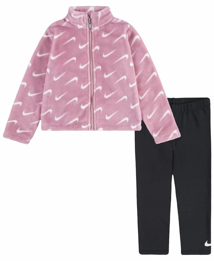 Equal parts sporty and comfy, the Nike Swoosh essentials leggings set includes a soft velvet full-zip jacket and stretchy jersey leggings for go-to comfort active kiddos need every day.