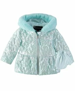 This blue puffer star quilted iridescent peplum fit jacket is a cold-weather must have for your little one. With a fleece lined hood and light blue fleece mittens this set will help keep them warm and cozy.