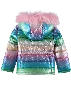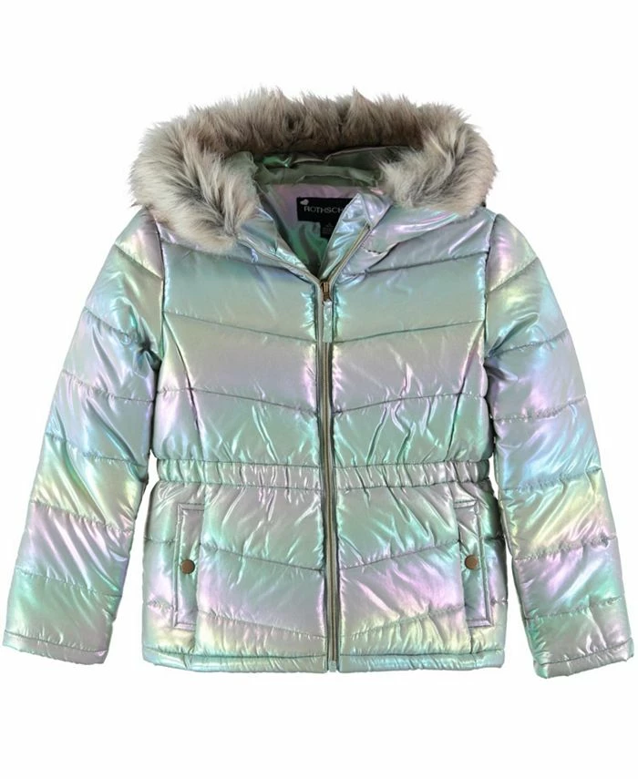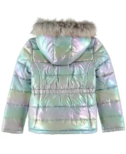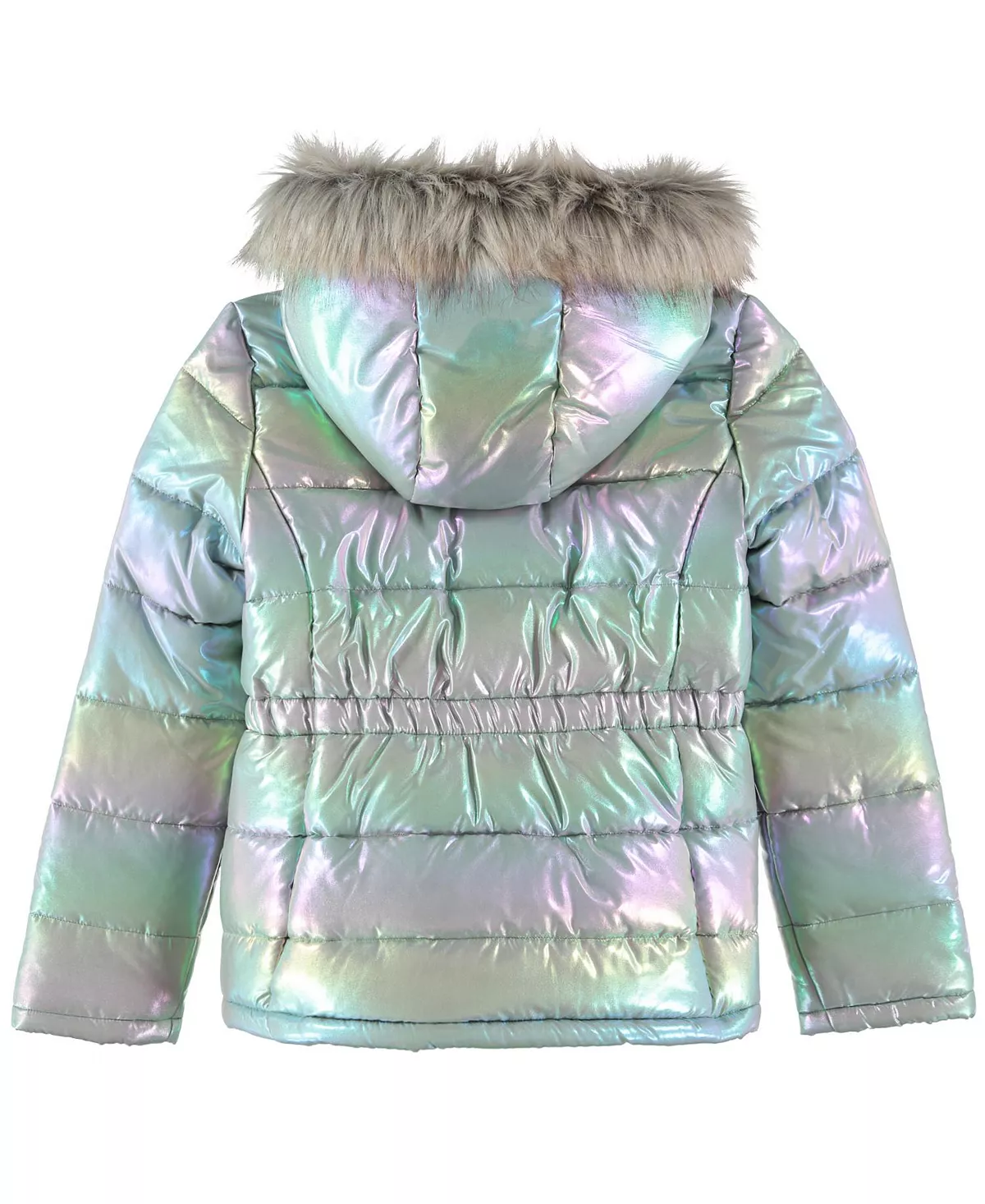Iridescent quilted parka with faux fur trim hood and snap pocket closure.