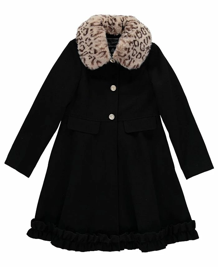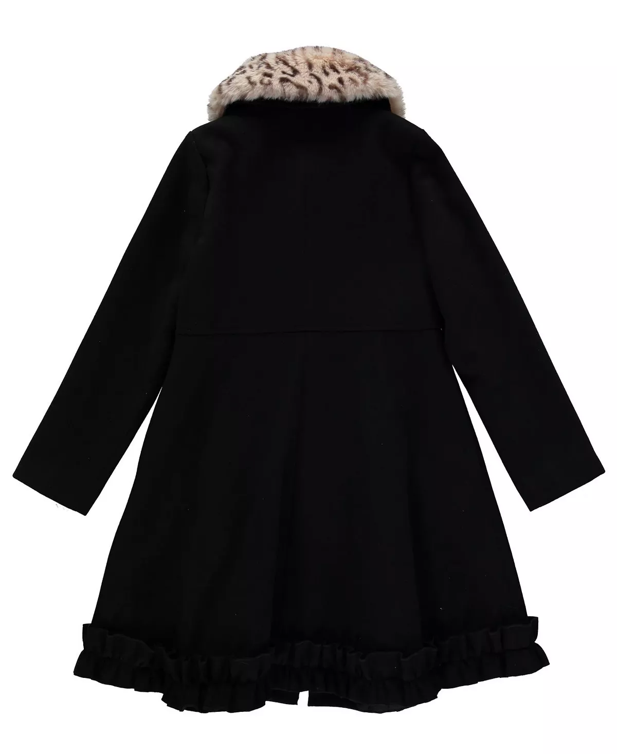 Solid faux wool dress coat with ruffle bottom and leopard print faux fur collar.