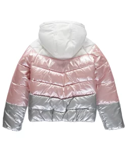 Colorblock puffer with metallic piecing’s and fleece liner.