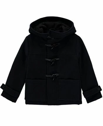 Solid toggle coat with plaid lined hood and scarf.
