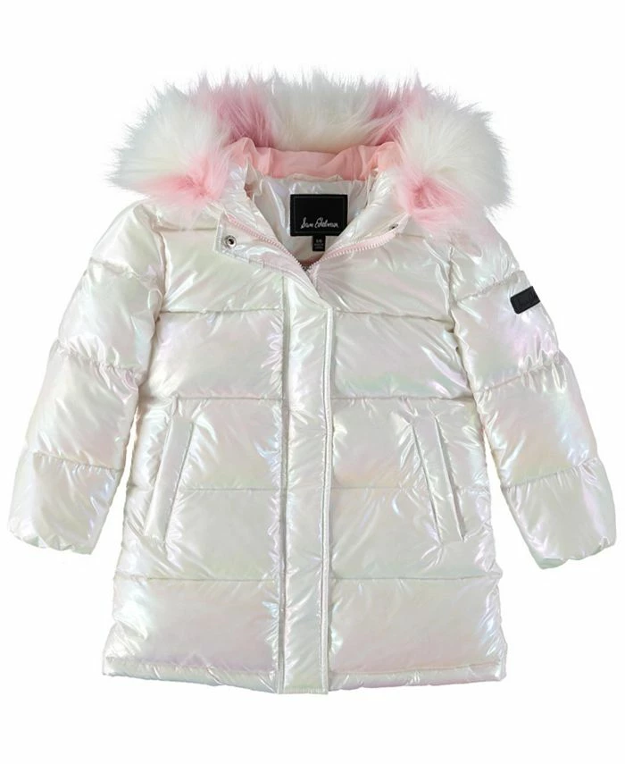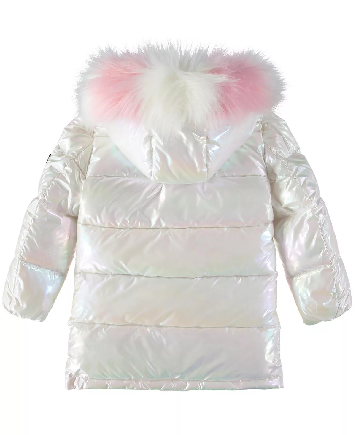 Quilted holographic solid long puffer with 2 tone faux fur trim hood.