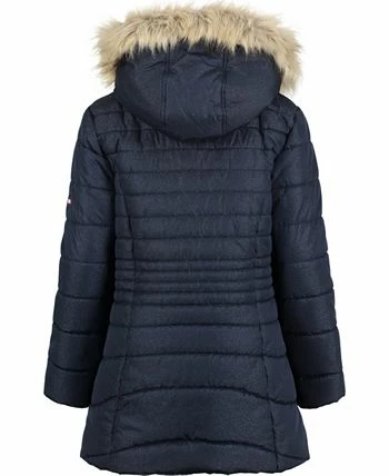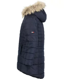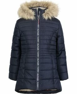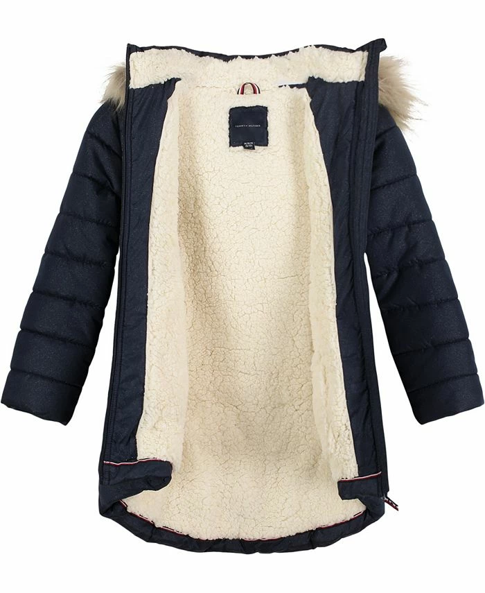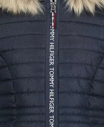 Logo-printed trim stands out on this hooded puffer jacket from Tommy Hilfiger, featuring a subtle sparkle throughout, faux fur trims the hood and sherpa fleece lines the interior for added warmth.